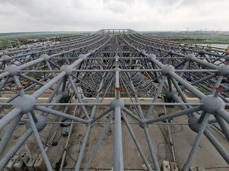 辦公樓-試驗(yàn)樓網(wǎng)架工程,網(wǎng)架長(zhǎng)度 81.8 米,寬度 32.4 米,支座高度26米。工程特點(diǎn):本工程節(jié)點(diǎn)球?yàn)楹附忧蚝吐菟ㄇ蛳嘟Y(jié)合,含鋼量較高、跨度大,結(jié)合本工程項(xiàng)目特點(diǎn)及危大工程管理要求,特編制頂升專項(xiàng)安全方案,并通過專家組論證后實(shí)施,本方案施工質(zhì)量更有保障、安全系數(shù)高。歷經(jīng)55天的我公司順利交付得到業(yè)主及總包單位的一致好評(píng)。