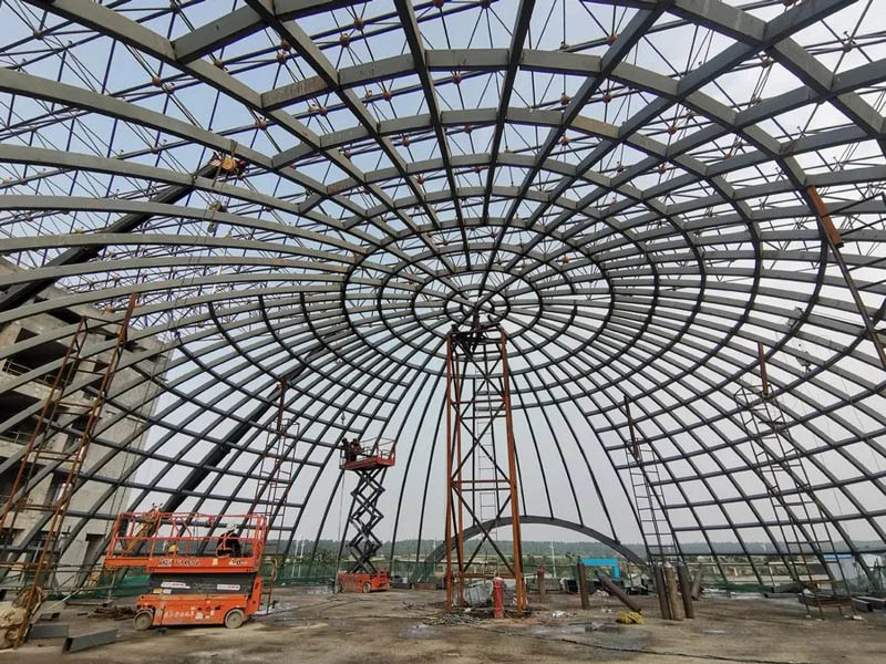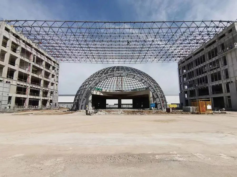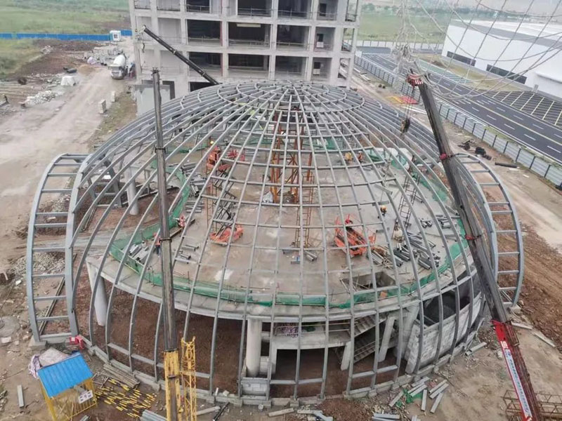 吉利飛行汽車項(xiàng)目汽車展廳鋼結(jié)構(gòu)工程,主體是直徑32米的橢圓形空間桁架結(jié)構(gòu),本工程加工工藝復(fù)雜,構(gòu)件數(shù)量多且雜,車間及現(xiàn)場(chǎng)焊接工作大,主構(gòu)件對(duì)接焊接均要求一級(jí)焊縫,施工期間兩臺(tái)全站儀同時(shí)不同角度測(cè)量,配合臨時(shí)支撐架現(xiàn)場(chǎng)有序、施工,整體工期45天。